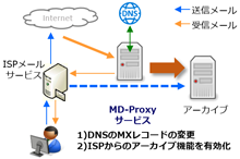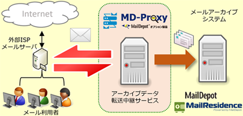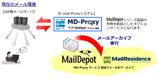 『MD-Proxy サービス』は、この課題を解決し ISPメールサービスから、MailDepot/MailResidence でのメールアーカイブを可能とする E-mail Proxy オプションとして提供します。