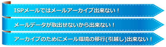 - 受信メールについては、ISPメールサービスで提供されるメールフィルタ機能適用前でのアーカーイブとなります